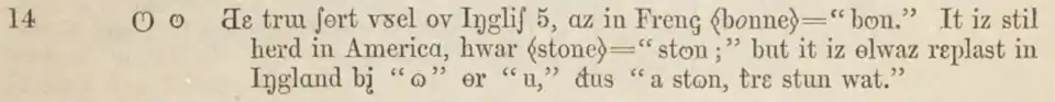 L’oméga fermé culbuté est utilisé comme lettre pour l’anglais dans la version de janvier 1846 de l’alphabet phonotypique d’Isaac Pitman et Alexander John Ellis, et comme lettre pour les autres langues dans la version de janvier 1848[1],[2]. Ellis l’utilise notamment dans un article décrivant la prononciation du scots en septembre 1848[3].