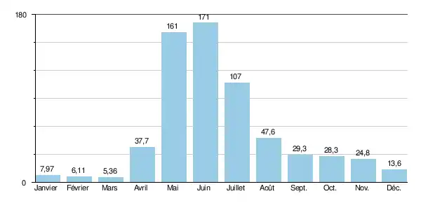 Les hautes eaux se déroulent du printemps à la fin de l'été, d'avril à août inclus, avec un sommet bien net en mai et juin, ce qui correspond au dégel et à la fonte des neiges.