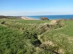 - une levée de galets en pente plus raide menant à l'ouest à une digue de mer avec une petite route et des villas et à l'est à une dune ;