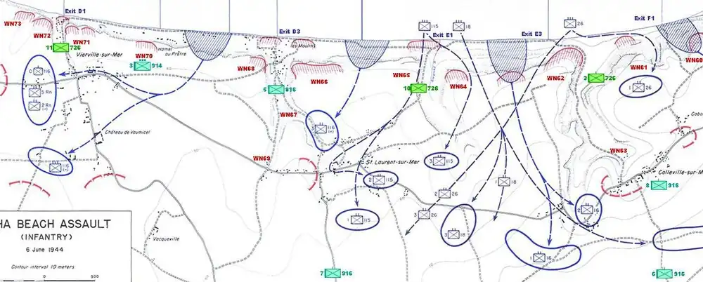- la présence inattendue de la 352e division allemande qui double le nombre de défenseurs. Ces vétérans sont plus expérimentés que les soldats de la 716e division d'infanterie composée de très jeunes recrues, de blessés et, parfois, des infirmes retirés du front russe ou des troupes recrutées parmi les prisonniers de l'armée Rouge qui refuseront de se battre lors du débarquement[15]. L'état-major de la 1re division d'infanterie américaine vient d'être alerté du déploiement de cette division de vétérans afin de participer à des exercices défensifs sur la côte, mais cette information n'a pu être répercutée aux troupes d'assaut, compte tenu du silence radio[16].
