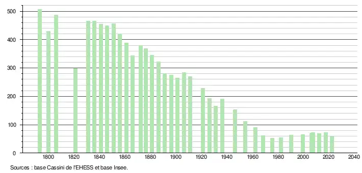 L'évolution du nombre d'habitants est connue à travers les recensements de la population effectués dans la commune depuis 1793. Pour les communes de moins de 10 000 habitants, une enquête de recensement portant sur toute la population est réalisée tous les cinq ans, les populations de référence des années intermédiaires étant quant à elles estimées par interpolation ou extrapolation[22]. Pour la commune, le premier recensement exhaustif entrant dans le cadre du nouveau dispositif a été réalisé en 2007[23].