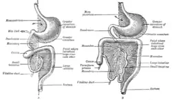 - Le grand épiploon ou grand omentum va de l'estomac au côlon transverse et forme un tablier à double feuillet qui se retrouve à la surface des intestins. Le grand épiploon est constitué par les ligaments gastro-phrénique, gastro-splénique et gastro-colique.