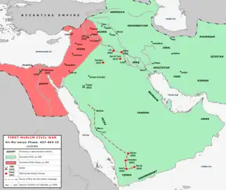 Territoires contrôlés par Ali (en vert, à l'est) et par Muʿawiya (en rouge, à l'ouest) au début de la Grande discorde.