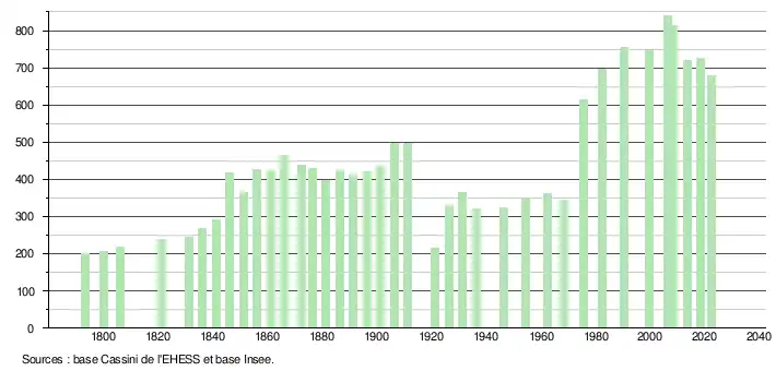 L'évolution du nombre d'habitants est connue à travers les recensements de la population effectués dans la commune depuis 1793. Pour les communes de moins de 10 000 habitants, une enquête de recensement portant sur toute la population est réalisée tous les cinq ans, les populations de référence des années intermédiaires étant quant à elles estimées par interpolation ou extrapolation[37]. Pour la commune, le premier recensement exhaustif entrant dans le cadre du nouveau dispositif a été réalisé en 2008[38].