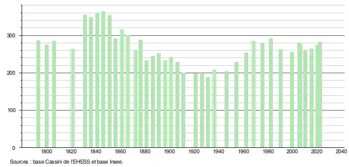 L'évolution du nombre d'habitants est connue à travers les recensements de la population effectués dans la commune depuis 1793. Pour les communes de moins de 10 000 habitants, une enquête de recensement portant sur toute la population est réalisée tous les cinq ans, les populations de référence des années intermédiaires étant quant à elles estimées par interpolation ou extrapolation[22]. Pour la commune, le premier recensement exhaustif entrant dans le cadre du nouveau dispositif a été réalisé en 2005[23].