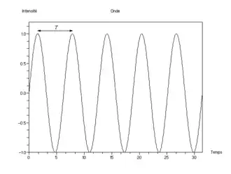 Si l'on se place à un endroit donné et que l'on relève l'intensité du phénomène en fonction du temps, on voit que cette intensité varie selon une loi, elle aussi sinusoïdale. Le temps qui s'écoule entre deux maxima est appelé période et est noté T.