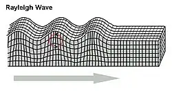 Les ondes de Rayleigh sont un type d'ondes de surface qui se déplacent près de la surface des solides. Les ondes de Rayleigh comprennent des mouvements longitudinaux et transversaux dont l'amplitude diminue de manière exponentielle à mesure que la distance par rapport à la surface augmente. Il existe une différence de phase entre ces mouvements[1]. Les ondes de Rayleigh ont été nommées d'après Lord Rayleigh, qui en 1885[2]avait mathématiquement prouvé l'existence de ces ondes avant même qu'elles ne soient observées[3]. Dans les vagues de Rayleigh, le sol roule dans un mouvement elliptique similaire aux vagues océaniques. Dans un demi-espace homogène, la polarisation est toujours rétrograde, c'est-à-dire que le mouvement de roulement s'effectue dans le sens opposé à la propagation de l'onde de Rayleigh. Dans le cas général, des ondes de Rayleigh polarisées progrades se produisent également. Ce roulis déplace le sol de haut en bas et d'avant en arrière dans la direction de propagation des ondes. La vitesse de propagation est d'environ 2 000-4 000 m/s, en fonction principalement de la longueur d'onde[4].