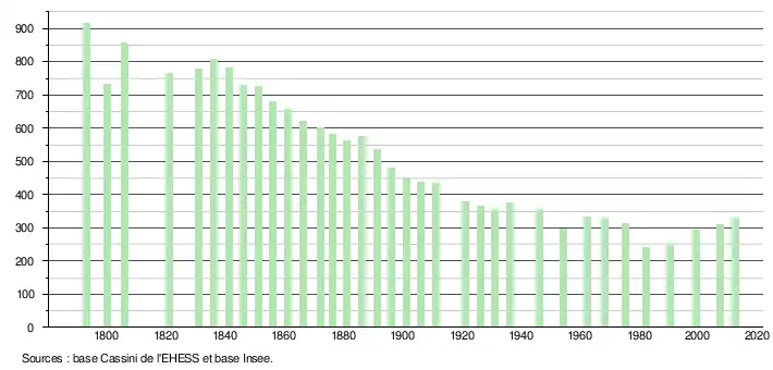 - ↑ Par convention dans Wikipédia, le principe a été retenu de n’afficher dans le tableau des recensements et le graphique, pour les populations légales postérieures à 1999, que les populations correspondant à une enquête exhaustive de recensement pour les communes de moins de 10 000 habitants, et que les populations des années 2006, 2011, 2016, etc. pour les communes de plus de 10 000 habitants, ainsi que la dernière population légale publiée par l’Insee pour l'ensemble des communes.