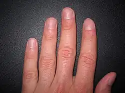 - Leuconychie (en) : coloration blanche de l'ongle (due à une perturbation de la kératinisation avec persistance des noyaux dans les cornéocytes de la tablette unguéale) existant sous deux formes, des petites surfaces à bords bien limités (lignes ou taches blanches appelées jadis taches de mensonges, en lien avec l'onychomancie voulant que leur nombre permettait de décompter les mensonges)[19], ou sur tout l'ongle (leuconychie vraie due à l'opacité de la tablette ou leuconychie aparente due à la paleur du lit unguéal). Les causes médicales sont variées[20].