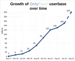 En , le PDG Timothy Stokely déclare au site Internet BuzzFeed « que le site gagne environ 200 000 nouveaux utilisateurs toutes les 24 heures et 7 000 à 8 000 nouveaux créateurs s'inscrivent chaque jour »[10]. En , Onlyfans comptabilise 300 millions d'utilisateurs.[réf. nécessaire] En , le site compte plus de 100 millions d'utilisateurs enregistrés et prétendait avoir versé annuellement plus de 3 milliards de dollars à ses 1 million de créateurs de contenu, principalement des personnalités des réseaux sociaux dont Mia Khalifa, Amouranth, Blac Chyna, Amber Rose, Lily Philips, Sophie Rain, Markiplier, ou des chanteuses et des rappeurs dont Cardi B, Bella Thorne, Bhad Bhabie, Iggy Azalea, Carmen Electra, Tyga ou Chris Brown[11].