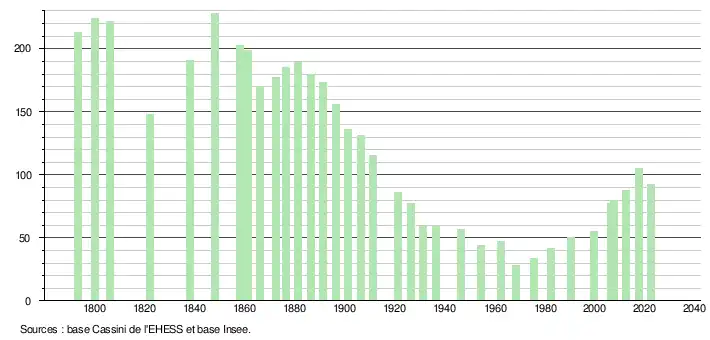 L'évolution du nombre d'habitants est connue à travers les recensements de la population effectués dans la commune depuis 1793. Pour les communes de moins de 10 000 habitants, une enquête de recensement portant sur toute la population est réalisée tous les cinq ans, les populations de référence des années intermédiaires étant quant à elles estimées par interpolation ou extrapolation[18]. Pour la commune, le premier recensement exhaustif entrant dans le cadre du nouveau dispositif a été réalisé en 2007[19].