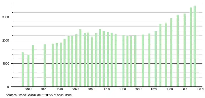L'évolution du nombre d'habitants est connue à travers les recensements de la population effectués dans la commune depuis 1793. À partir du , les populations légales des communes sont publiées annuellement dans le cadre d'un recensement qui repose désormais sur une collecte d'information annuelle, concernant successivement tous les territoires communaux au cours d'une période de cinq ans. Pour les communes de moins de 10 000 habitants, une enquête de recensement portant sur toute la population est réalisée tous les cinq ans, les populations légales des années intermédiaires étant quant à elles estimées par interpolation ou extrapolation[11]. Pour la commune, le premier recensement exhaustif entrant dans le cadre du nouveau dispositif a été réalisé en 2007[12],[Note 1].