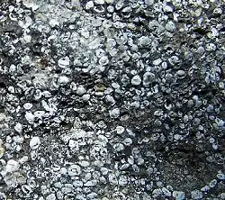 Roche phosphatée oolithique datée du Permien (Montana, USA). Les "grains" mesurent en moyenne 1 mm de large.