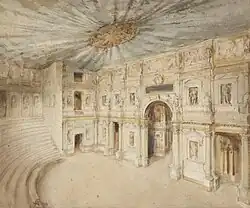 La musique vocale, qui n'est pas encore d'opéra, résonne aussi dans les théâtres publics comme l'Olimpico, bâti à Vicence par Andrea Palladio pour l' Accademia olimpica selon les préceptes de Vitruve, et où les chœurs d'Andrea Gabrieli viennent s'insérer dans la représentation d'Œdipe roi de Sophocle donnée pour l'inauguration le [15]. Et le premier des oratorios, La Rappresentatione di anima e di corpo d'Emilio de' Cavalieri est donné sous la forme d'un opéra sacré mis en scène dans les murs de l'ancien oratoire de la Vallicella à Rome, siège de la congrégation des oratoriens, en février 1600[16].