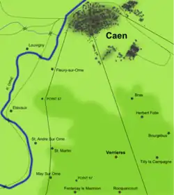 Le matin du , aidé d'un imposant soutien aérien, les éléments avancés de la 2e division d'infanterie canadienne capturent Colombelles et Faubourg-de-Vaucelles, villes banlieues industrielles au sud de Caen le long de l'Orne. Au cours de l'après-midi deux compagnies de Black Watch parviennent à traverser la rivière, la Compagnie A perdant au passage une vingtaine d'hommes[41]. Des bataillons supplémentaires de la 5e Brigade arrivent à avancer au sud de Saint-André-sur-Orne[42]. Une fois la rive est de l'Orne sécurisée, les forces des 4e et 6e Brigades d'infanterie canadienne se placent en position en vue d'une attaque de la crête de Verrières, se préparant à engager les forces des 12e et 1re Panzerdivisions SS[43].
