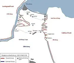 Dans la zone de la 2e armée de choc et de la 8e armée soviétique la défense est tenue par la 227e division d'infanterie, moins un régiment, la 1re division d'infanterieet un régiment de la 223e division d'infanterie et de la sécurité 207e division de sécurité[5]. Les principaux points de résistance étaient Lipka, la cité ouvrière no 8, Krouglaïa Grove et les villages de Gaïtolovo et Tortolovo.