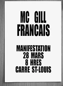 - ↑ La plupart des médias de l’époque évaluent la foule de 10 000 à 12 000 manifestants (Claude Gravel, « Tout a bien fonctionné », La Presse, , p. 1; François Barbeau, Jean-Claude Leclerc et Normand Lépine, « Malgré un climat de tension extrême, la manifestation tant redoutée s’est déroulée sans incident majeur », Le Devoir, , p. 1; Presse canadienne, « McGill : vitrines brisées et incendies dans les rues », La Tribune, , p. 1; Bernard Racine, « Une manifestation bruyante d’une heure et la police disperse ensuite la foule », L’Action, , p. 1). D’autres médias rapportèrent une foule moins nombreuse, de 5 000 à 6 000 personnes (Jos.-L. Hardy, « McGill respire », Le Soleil, , p. 1; Gilles Moreau, Paul Racine, Normand Lester, André Dubois, « Manifestation McGill français », Société Radio-Canada, ; Presse canadienne, « La manifestation à McGill attire plus de 6 000 participants », Le Nouvelliste, , p. 1).