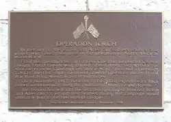 - ↑ Traduction : « OPERATION TORCH. À la mémoire des marins, soldats et pilotes britanniques et américains qui ont risqué leur vie pour la libération de l'Afrique du Nord durant la Seconde Guerre mondiale. Depuis leur quartier général de la Forteresse de Gibraltar, le lieutenant-général Dwight David Eisenhower, US Army et l'amiral Andrew Browne Cunningham, Royal Navy, ont dirigé l'opération TORCH, la première opération majeure combinée de combat de la Seconde Guerre mondiale impliquant des forces américaines et britanniques. Le , des éléments de la force expéditionnaire des Alliés débarquèrent simultanément le long des côtes du Maroc et de l'Algérie. Les leçons enseignées et les relations forgées entre les forces britanniques et américaines et leurs chefs durant cette campagne mèneraient finalement à la libération de l'Europe ».