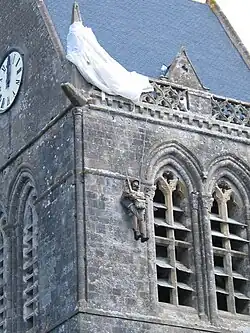 Le largage de la 82e commence vers 1 h 50, à l'aide de 369 Dakota. Ici aussi, la dispersion est grande. Plusieurs hommes tombent dans les inondations des vallées de la Douve et du Merderet. Il y a moins de noyades que ce qui a parfois été dit. Beaucoup de matériel, par contre, est perdu et les hommes qui s'extirpent des marais ne sont guère opérationnels. Comme deux sticks de la 101e qui y étaient déjà tombés un peu avant eux, quelques parachutistes atterrissent directement sur le village de Sainte-Mère-Église. Le plus connu d'entre eux est certainement le soldat John Steele dont le parachute est resté accroché au clocher de l'église. Toutefois, l'historien Jean Quellien rapporte que Steele n'était pas le seul para resté accroché au clocher et qu'un deuxième homme se serait retrouvé un temps dans cette situation, avant de pouvoir se détacher. De plus, il explique que les deux hommes étaient suspendus de l'autre côté de l'église,et non face à la grande place de Sainte-Mère église[4].