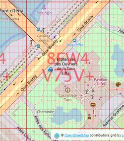 La grille la plus large désigne des blocs de 20 ° de côté en deux caractères. Tandis qu'un code de 10 caractères seulement désigne une zone d'environ 13 mètres de côté (permettant de localiser une maison). L'ajout de simplets éventuels permet de désigner un objet précis, par exemple une porte d'accès.