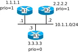 Si les trois routeurs sont démarrés simultanément, R2 deviendra le DR en raison du router-id plus élevé et R1 le BDR. R3 ne participe pas à l'élection du DR car sa priority vaut 0.