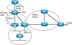 R1, R2 et R3 sont des routeurs backbone. R1, R2 et R4 sont des ABR. R4 et R8 sont des ASBR. L'area 3 est connectée à l'area 0 grâce à un virtual link.
