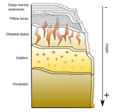 Une dorsale (ride médio-océanique) est formée par une remontée convective du manteau plastique (asthénosphère). Les conditions de pression et de température permettent un début de fusion du manteau à partir de 75 km de profondeur. Les péridotites du manteau supérieur, productrices de basalte par fusion partielle, sont des lherzolites (olivine + orthopyroxène + clinopyroxène + plagioclase). Elles forment le manteau dit "fertile". Au-dessus viennent les harzburgites (olivine + orthopyroxène + spinelle), résidu des lherzolites après extraction du liquide basaltique, puis les dunites (roches encore plus réfractaires). Ces deux dernières formes de péridotites constituent le manteau dit "appauvri". Au-dessus du Moho, à la base de la croûte, le liquide basaltique s'accumule dans une chambre magmatique (elle peut atteindre quelques dizaines de kilomètres de largeur, quelques kilomètres de hauteur) située sous la dorsale. En se refroidissant lentement (passant de 1 200 degrés à 950-1 000 degrés), il donne naissance aux gabbros lités. Ces gabbros, très proches chimiquement des basaltes, s'en distinguent par une cristallisation grossière, réalisée lentement à la base de la chambre magmatique, ainsi qu'au contact des parois, refroidies par la circulation hydrothermale. Ils sont surmontés par des gabbros non lités (gabbros isotropes) ayant cristallisé plus rapidement au toit de la chambre magmatique. Les basaltes du complexe filonien s'y enracinent. Ils alimentent les coulées de lave et les laves en coussin par fracturation de la partie supérieure de la croûte. L'épaisseur de la couverture basaltique (complexe filonien + coulées de lave) est de l'ordre de 2 000 m. Cette couverture est elle-même recouverte par des sédiments de plaine abyssale : les radiolarites.