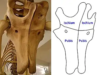 Une autre caractéristique d'Opisthocoelicaudia s'observe au niveau du bassin qui montre une symphyse pubienne soudée ce qui renforce l'aptitude de l'animal à se tenir sur ses pattes arrière en s'appuyant sur sa queue.