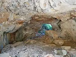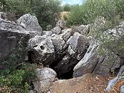 L'Aven des Amandiers. Il s'agit du ponor principal du poljé karstique d'Opoul[13]. L'eau qui s'écoule périodiquement sur la surface normalement sèche de dépressions calcaires comme ce poljé - par exemple, lors de très fortes pluies - descend dans des cavités comme ce ponor, et disparaît sous terre. Dans cette partie du massif des Corbières, l'eau finit par émerger à la magnifique Font Estramar, sur la rive occidentale de l'Étang Salses-Leucate.