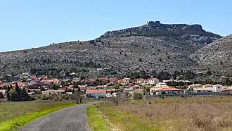 La butte du château d'Opoul. Les vestiges du château d'Opoul sont situés sur une butte isolée sur le bord sud du plateau de Périllos, juste au-dessus du village d'Opoul. Cette colline se trouve sur un "synclinal perché", avec des calcaires crétacés plus élevés, de couleur plus foncée, séparés des calcaires en-dessous plus anciens, de couleur plus claire, par une couche de marne[16]. L'altération et l'érosion pendant des millions d'années de la marne, moins résistante, ont isolé la colline et sapé le calcaire dur, créant ainsi les impressionnantes falaises de la butte qui dominent maintenant le paysage environnant.