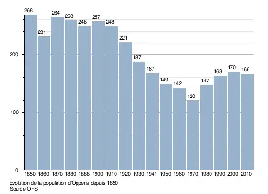 La population d'Oppens est de 268 personnes en 1850, puis de 231 personnes dix ans plus tard et 264 personnes vingt ans plus tard. Le nombre d'habitants est ensuite stable jusqu'en 1910, puis baisse progressivement jusqu'à 120 en 1970. Il remonte depuis et atteint 170 en 2000. Le graphique suivant résume l'évolution de la population d'Oppens entre 1850 et 2010[11] :