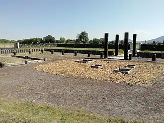 - ↑ Vestige archéologique : grande fosse circulaire pouvant servir de libation de sang, bloc quadrangulaire en basalte interprété comme une pierre dʼautel à sacrifice comme le suggèrent les traces dʼincisions par lame à sa surface.