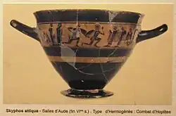Dans cette dernière catégorie il faut signaler un beau skyphos (gobelet) de la fin du VIe siècle représentant un combat d’hoplites (combattants) et conservé au Musée des Corbières (Sigean).