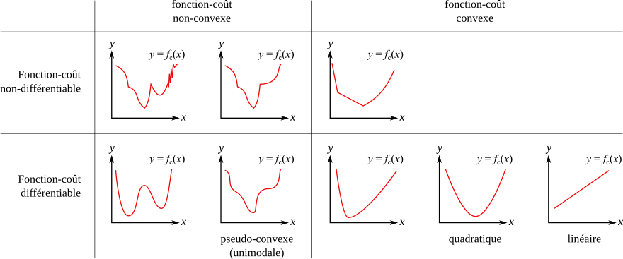 - la nature de la fonction objectif , de sa régularité (continuité, dérivabilité), de propriétés spécifiques (parité, convexité), de la connaissance de voisinages de ses extrema,