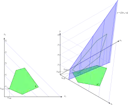 Une optimisation linéaire en dimension deux consiste en général à dessiner l'ensemble admissible (polygone convexe borné ou non) et à chercher la meilleure position d'une droite de direction fixée pour rendre maximale ou minimale une valeur donnée. Cette droite, si elle existe, passe toujours par un sommet du polygone. Dans une optimisation linéaire de dimension trois, l'ensemble admissible est un polyèdre et l'optimisation consiste à trouver la meilleure position d'un plan de direction fixée.