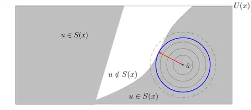 où représente la valeur nominale du paramètre, représente une boule de rayon centrée en et représente l'ensemble des valeurs de qui satisfont le problème dans les conditions de stabilité et de performance associées à la décision comme on peut le voir sur l'image suivante :