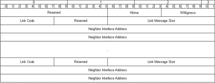 - « Link Code » : Code identifiant le type de lien (pas d'information, symétrique, asymétrique, etc.) entre l'expéditeur et les interfaces listées (« Neighbor Interface Address »)