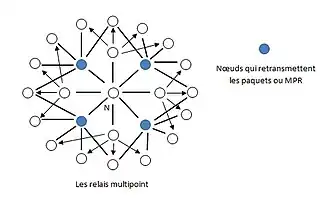 L'idée des relais multipoints est de minimiser l'inondation de paquets de diffusion dans le réseau en réduisant les retransmissions en double vers un même nœud. Chaque nœud dans le réseau sélectionne un ensemble de nœuds dans son voisinage, qui retransmet ses paquets. Cet ensemble de nœuds voisins sélectionné est appelé le relais multipoint de ce nœud ou MPR[2].