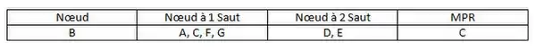 La sélection des MPR est le point clé dans le protocole OLSR. La sélection du MPR se fait en choisissant le nœud voisin à un saut. S’il y a plusieurs nœuds, le nœud choisi est alors celui qui a le plus de voisins[1]. Le tableau montre comment le nœud B sélectionne un MPR, basé sur le réseau représenté dans la figure :
