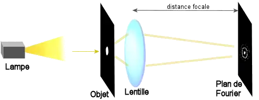 Le plan focal de la lentille, où se forme la transformée de Fourier de l'objet, est appelé plan de Fourier.