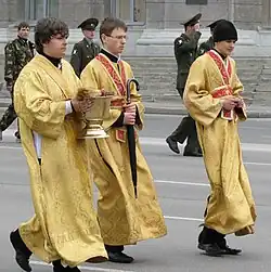 Le sous-diacre porte l'orarion simple replié en forme de croix en signe de ce qu'il n'a pas encore reçu l'ordre diaconal.