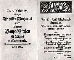 L'oratorio a été écrit pour les fêtes de Noël de l'hiver 1734-1735. La partition originale montre les détails des exécutions. Les cantates ont été entendues dans les deux plus importantes églises de Leipzig, Saint-Thomas et Saint-Nicolas. Comme on peut le voir ci-dessous, l'œuvre a été donnée en entier à Saint-Nicolas :