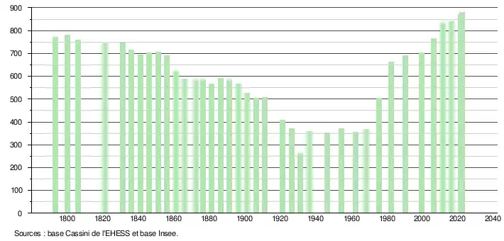 L'évolution du nombre d'habitants est connue à travers les recensements de la population effectués dans la commune depuis 1793. Pour les communes de moins de 10 000 habitants, une enquête de recensement portant sur toute la population est réalisée tous les cinq ans, les populations de référence des années intermédiaires étant quant à elles estimées par interpolation ou extrapolation[15]. Pour la commune, le premier recensement exhaustif entrant dans le cadre du nouveau dispositif a été réalisé en 2006[16].