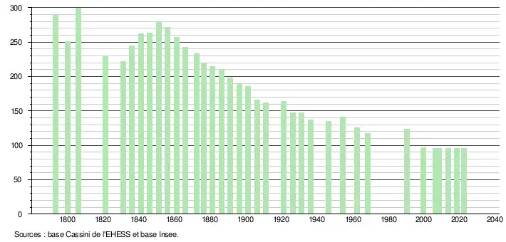 L'évolution du nombre d'habitants est connue à travers les recensements de la population effectués dans la commune depuis 1793. Pour les communes de moins de 10 000 habitants, une enquête de recensement portant sur toute la population est réalisée tous les cinq ans, les populations de référence des années intermédiaires étant quant à elles estimées par interpolation ou extrapolation[15]. Pour la commune, le premier recensement exhaustif entrant dans le cadre du nouveau dispositif a été réalisé en 2008[16].