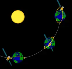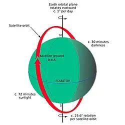L'orbite héliosynchrone est une orbite polaire basse (entre 200 et 1 680 km) et de périodicité courte (décrite toutes les 88 à 120 minutes)[1].