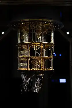 Un ordinateur quantique, calculateur quantique, processeur quantique[3],[4] ou système informatique quantique[5], utilise les propriétés quantiques de la matière, telles que la superposition et l'intrication, afin d'effectuer des opérations sur des données. À la différence d'un ordinateur classique basé sur des transistors travaillant sur des données binaires (codées sur des bits, valant 0 ou 1), l'ordinateur quantique travaille sur des qubits dont l'état quantique peut posséder plusieurs valeurs, ou plus précisément une valeur quantique comportant plusieurs possibilités simultanées[6].