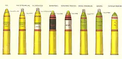 De gauche à droite : obus HE standard, aérodynamique et d'entrainement, 2 shrapnels (dont un d'entrainement), obus fumigènes aérodynamique et standard, obus antiblindage.