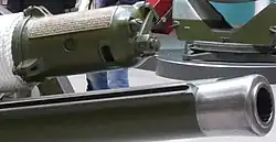 Le récupérateur court de l'affût Mk I au-dessus du tube est entouré d'une épaisse corde pour sa protection.