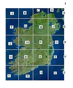 L’île d’Irlande est divisée en 20 cases de 100 km de côté, chacune identifiée par une lettre. Chaque case possède une graduation numérique en partant du coin sud ouest. Par exemple G0305 signifie Case G 3 km est, 5 km nord.