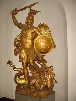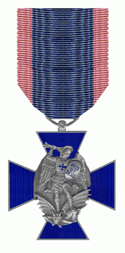 - l'autre, constitué d'une croix toute simple émaillée de bleu nuit (surmontée ou non d'une couronne selon la classe) surchargée d'un médaillon central ovale représentant saint Michel terrassant le dragon avec, sur son bouclier, la devise « Quis ut Deus ». Au revers du médaillon central figure le mot « Virtuti ».